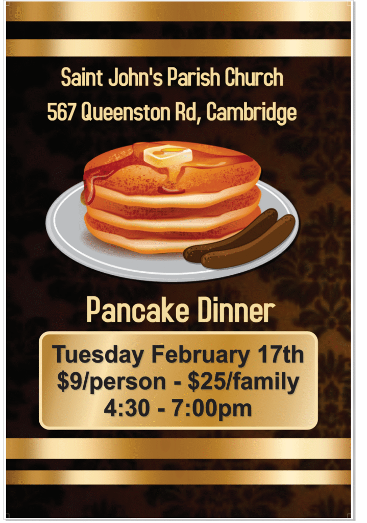Join us on Shrove Tuesday (Feb 17th) for out Pancake Dinner! Dinner runs from 4:30-7pm. To purchase tickets, please call Rev. Steven or the church office.
